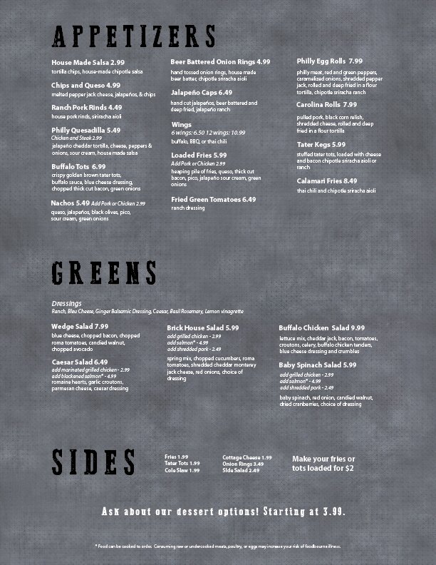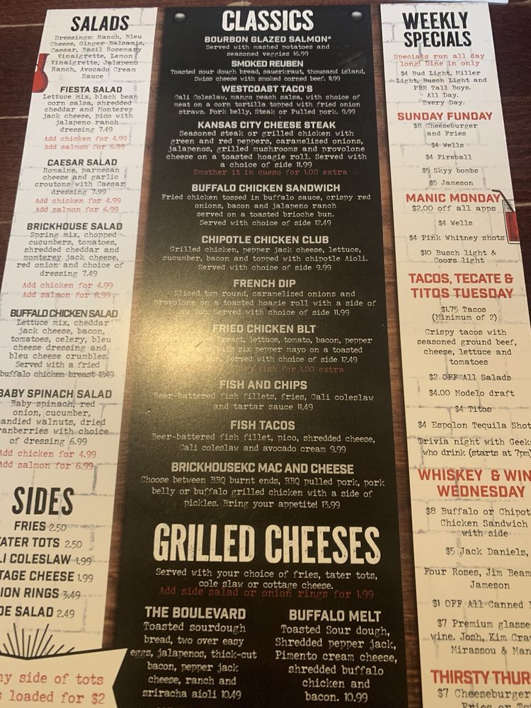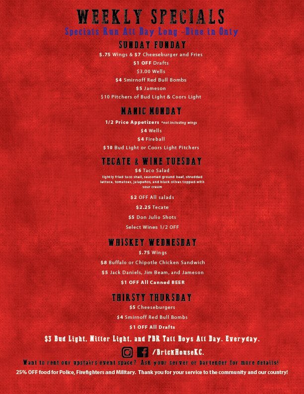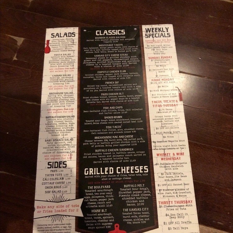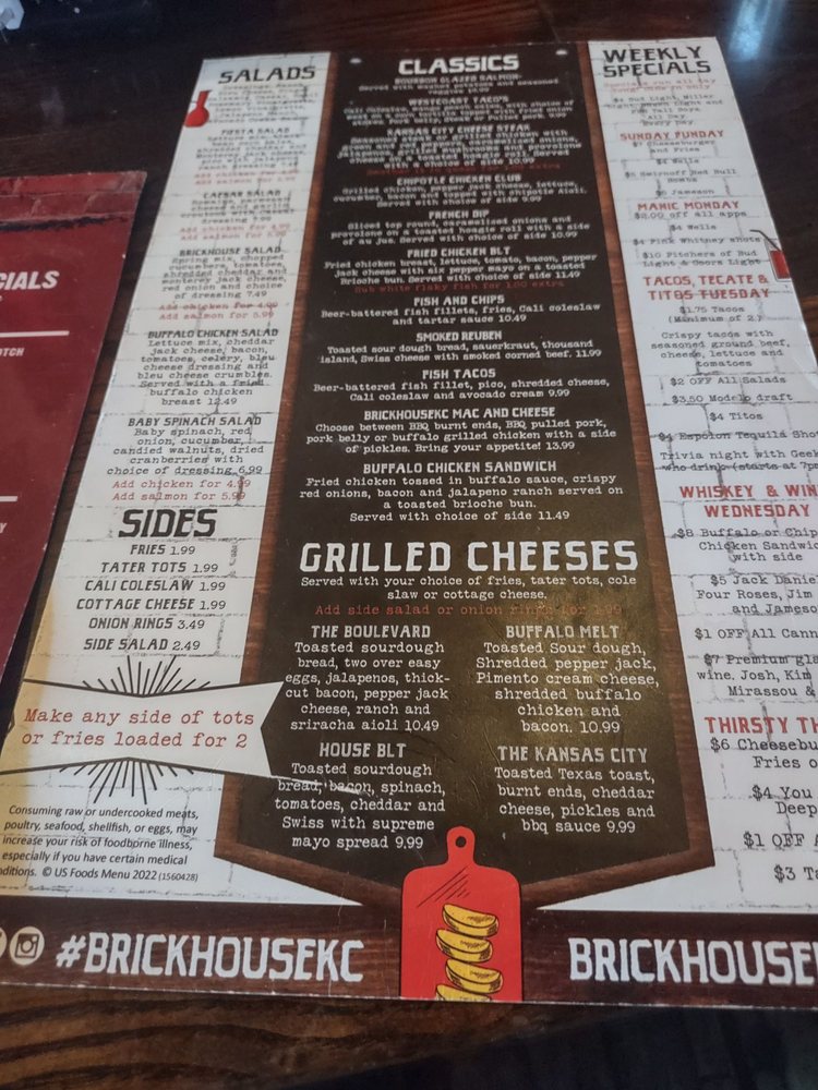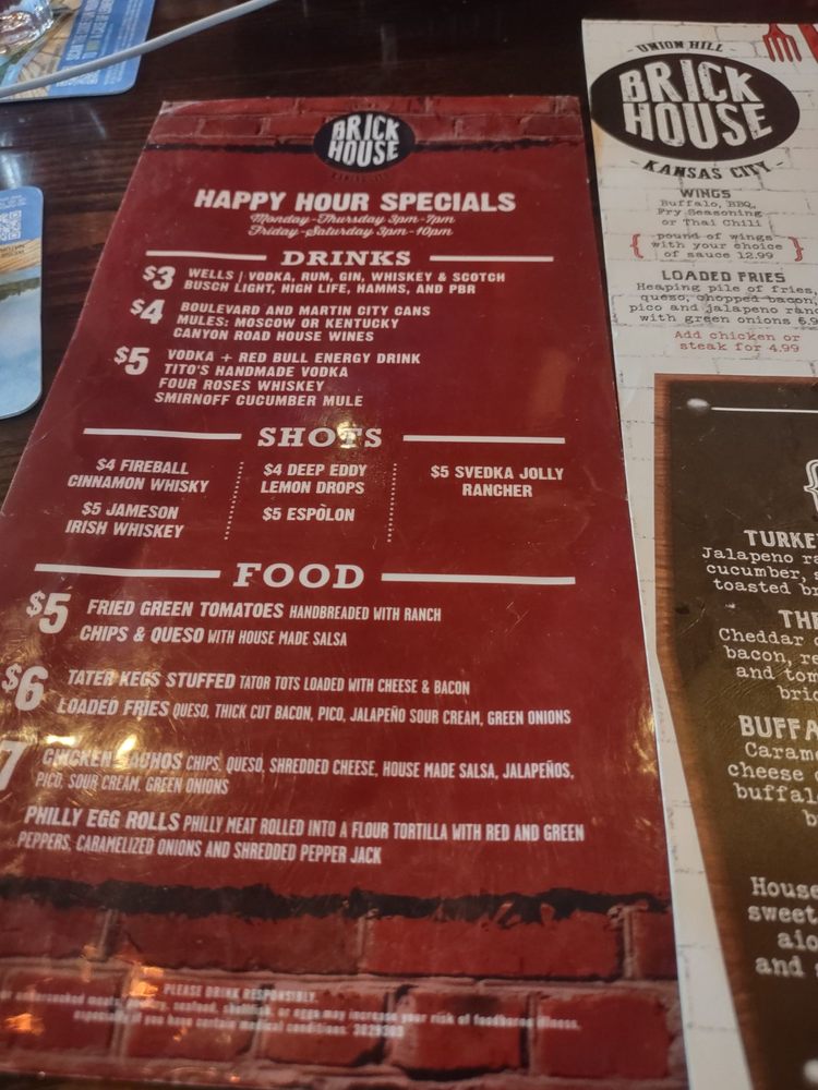 Brick House, located in Kansas City, MO, is a vibrant Beer Bar and Sports Bar offering a wide range of American cuisine. With options for vegan and vegetarian customers, this restaurant provides a diverse menu with appetizers like Wings and Philly Egg Rolls, salads including Buffalo Chicken and Caesar, and delicious sandwiches like Hot Hands and K.C. Burger. Customers rave about the Brickhouse special for brunch, featuring a biscuit, chicken, and sunny side egg, paired perfectly with a peach mimosa. While some patrons mention loud music and automatic drink service, the overall consensus is positive, highlighting the flavorful dishes and attentive service. Don't miss out on the happy hour specials and live music events on Thursdays, Fridays, and Saturdays at Brick House!
